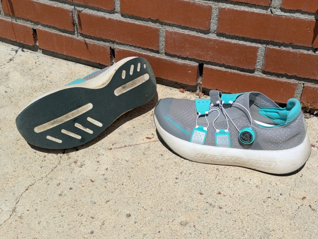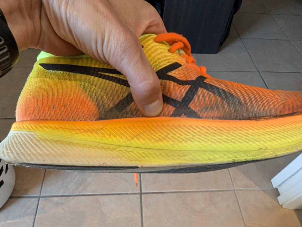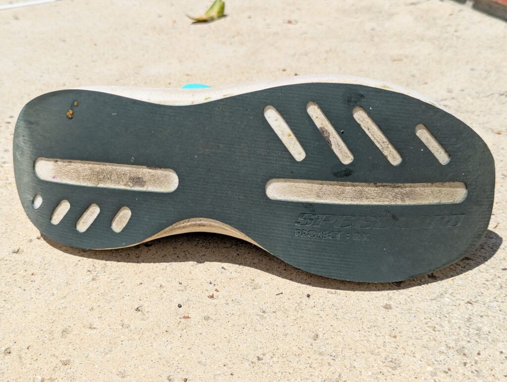 Unlike with the GS, Speedland doesn’t advertise their partners on the RX, except for BOA. With the GS, the outsole is by Michelin and the plate is by Carbitex. On the RX, everything is either Speedland branded or unbranded. The completely smooth outsole looks a lot like the Adidas rubber sourced from Continental, except it’s not black. I found the outsole to be extremely durable, which is, I think, a benefit of the non-treaded designs. Treaded designs seem to wear a bit less evenly, and – fundamentally – just have less rubber because of the texturing of the tread. While I didn’t get to test wet weather performance in any meaningful way, I did find the tread was extremely grippy across pretty much any conditions, including some modest dirt. Adidas makes a wager with its Contintental rubber, as with bike tires, that tread on the road doesn’t actually provide much grip; it’s asphalt that provides the grip. And that rubber compound matters much more than tread design. I concur. That this also helps with durability is a bonus. Better gripping rubber that also lasts longer is a win. And durability is super important because Speedland shoes last. While I haven’t yet logged the same big miles in the RX, my first pair of GS went 800mi (1300km) – on trails – before I finally retired them to wear-around shoes. And it was ultimately the tread (or lack thereof) that made me give them up. I don’t know if the uncompressed foam of the RX will last quite as long as the compressed foam of the GS (I expect it won’t), but it will still be a challenge for the outsole to last as long as the rest of the shoe, especially running on the road.