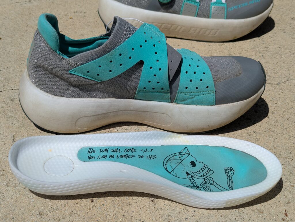 When I first discovered Speedland’s GS:TAMs in the summer of 2023, one of my first thoughts was that a road version of that shoe might be the perfect Ironman marathon shoe. It had all the performance of a modern super shoe with ultra bouncy PEBA foam and a (uniquely removable) carbon plate. In addition to the removable plate, the GS also had some other unique features that I thought made it particularly suited to ultra distance triathlon. The BOA dials made it fast to adjust tension quickly, a real bonus when dealing with swelling feet. And the seamless upper and roomy toebox are great for preventing hotspots. But the real feature that I thought made it so ideal is its “in” the midsole foot placement rather than “on top” of the midsole. I first experienced this on the original Hoka Bondi B, but Hoka has largely abandoned this approach to shoe design over the years. Lamentably. This was, in my opinion, the most important aspect of those early Hokas and how, in spite of being such high stack shoes, they were so stable. Because the foot is really cradled by the upper and supported by a lot more of the midsole than in most modern shoes where you really are reliant solely on the upper for lateral support rather than the midsole. Speedland achieves this in part by making the removable sock liner a key part of the shoe. A lot of the foam in the midsole is in the sockliner, which also serves to hold the removable carbon plate. As I said in the review of the GS, this does mean you can’t use orthotics with Speedland shoes, but this is a conscious decision on their part and an accepted limitation.