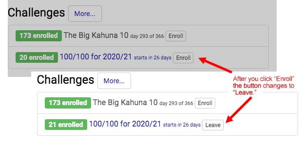 How do you enter the 100/100 Challenge? You go to our Training Log, select Challenges, and you’ll go to ongoing and ready-to-start challenges. Click “Enter” and you’re entered. That’s it.