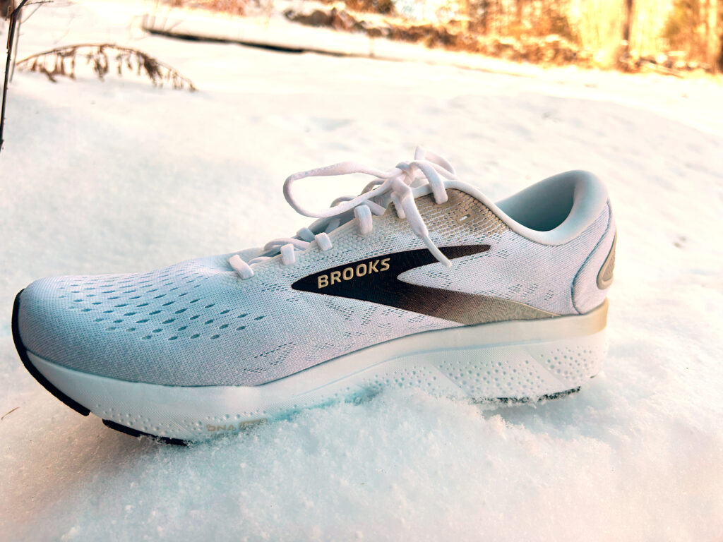 The big story with Ghost is softness. To achieve that, Brooks uses what they call DNA Loft v3 for the midsole. DNA Loft v3 features a proprietary blend of EVA, rubber, and nitrogen infusing together. It’s Brooks softest of their four cushioning materials on offer, and it’s their second lightest behind DNA Flash (typically used in racing models). To that end, a men’s size 9 weighs in at 9.5 ounces — anything under 10 ounces for a typical training shoe is on the lighter side. The upper is spun from 67% recycled materials, with limited seaming to reduce friction. In total, over 4 plastic water bottles were diverted from landfills to create the shoe, which earned it certified CarbonNeutral status.