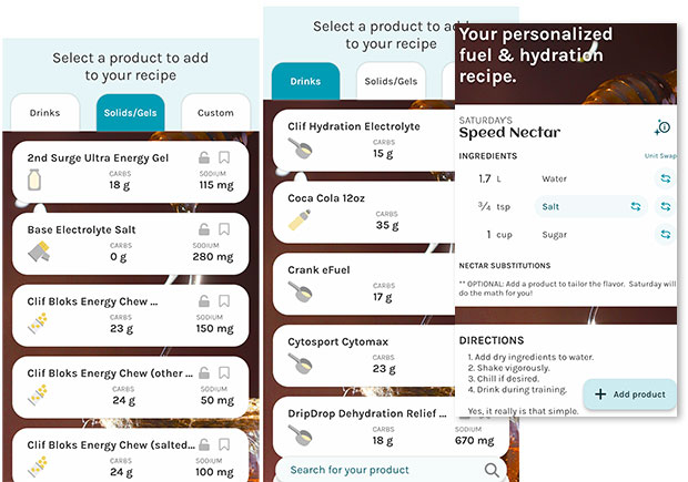 Let me show you how to use this as a guide. Does a system tend to lead you toward the behavior that most good athletes engage in most of the time? For example, does a coaching system, or a way to figure out your proper training or racing nutrition, or a diet for your breakfast, lunch and dinner meals, lead you toward “consensus” behavior? Or does it try to steer you away from it? Let’s consider another example. A Slowtwitcher, Dr. Alex Harrison, has an app available that is designed to prescribe for you your ideal training and racing nutrition. The app, called Saturday, asks questions that could reasonably be used to calculate a nutrition plan (age, weight, activity type, gender, sweat rate and so on). I’ve included several screen shots above because this highly prescriptive program tends to erect guardrails funneling you into a conforming regimen, rather than recommending Uruguayan Ginger Ale spiked with eye of newt once every 45 minutes during cycling. Secondly, look at the output: a bunch of products not made or sold by Saturday!