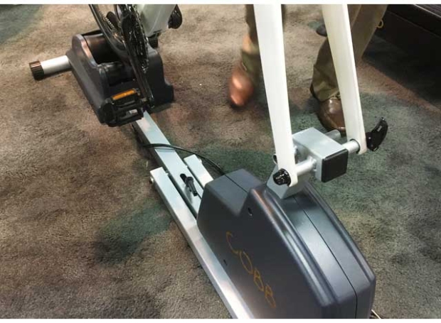 John Cobb said his company’s new trainer is powered by the rider, with a supplemental assist from AC power. Claimed is the ability to resist 2000 watts, so even if that is an ambitious number by double that’s enough for anybody’s training needs. And, same thing, film the course and if it’s a video synced with GPS the trainer inclines the bike as the course inclines.