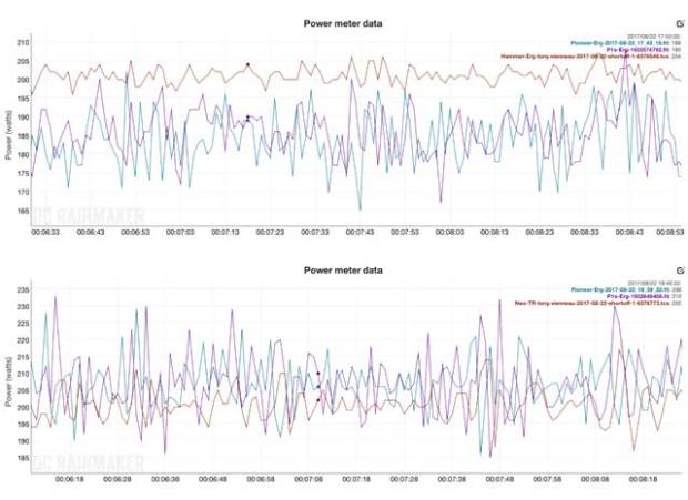 The good news, at more realistic power outputs and steady state efforts, these differences became smaller. The above two graphs are 200 watt intervals on TrainerRoad, the top graph using the Hammer and the bottom one using the Neo. The Hammer, although steady, showed elevated watts (15 watt interval average) versus the Neo (4 watts) compared to both the P1s and the Pioneer power meter.