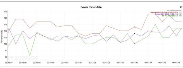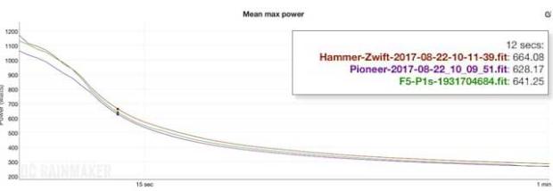 At extreme wattages, either high or low as shown in the above two graphs, the Hammer measured noticeably, and constantly, higher than both the Pioneer and P1s power meters.