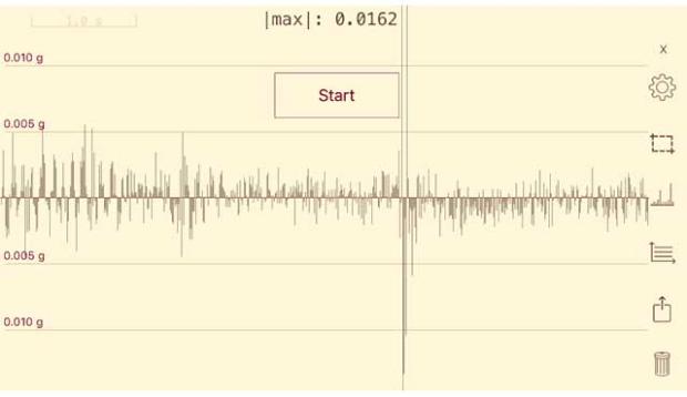 Vibration is a topic often mentioned as influencing the sound made by indoor trainers, particularly for individuals who live in apartments. The above image shows vibration at 200 watts using the Tacx Neo while the below image is 200 watts using the Hammer, both on a hardwood floors. Although the Neo is quieter, it was the Hammer that appears to produce less floor vibration, both in terms of the data and feel on the bike. This was measured using a mobile application.