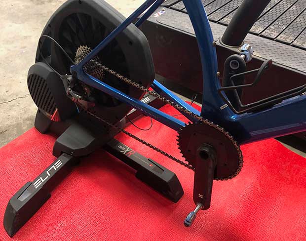 I thought I detected a very slight indexing – for lack of a better term – when pedaling, like the steering indexing you’d feel in an older bike with ball-in-cage headseat bearings, where the headset was bike assembled to tightly, forcing the steel bearings to imprint on the bearing races. This, in my attempt to tweeze out any differences between this and other trainers. But I changed bikes and that indexing sensation went away (the indexing was in the drive train of the bike I had on the trainer). There is a protrusion in the frame, on the drive side, that isn’t a feature of other direct drive trainers. I wondered if that might interfere with any longer cage derailleurs, so I put a gravel bike on the trainer with a SRAM Eagle RD, made for 10-50 cassettes. No problem. I tried hard to find a fault with this trainer, but I just kept coming up empty.