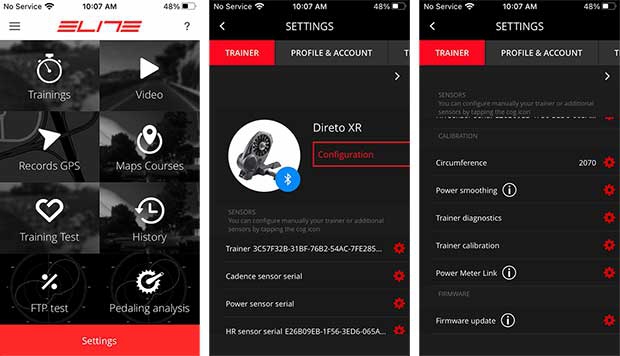 As you see, in the screens above, you’ve got a lot of options in the MyE-Training app. You get to the middle screen by clicking SETTINGS at the bottom of the intro screen on the left. The screen on the right is the same as the screen in the middle, you just scroll down to get to all the offerings on the right, which include calibration (as you see) and firmware update.