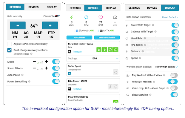 What does differentiate are the breadth and depth of curated video content, and the integration of high quality non-cycling content. After being lured away by the novelty or simplicity of other apps, I’ve found myself returning to SUF because the combination of flexible content and features is something that I find I can use consistently. And because of the simple – but powerful and intriguing – testing and training methodology that will be described in the next article in this series.