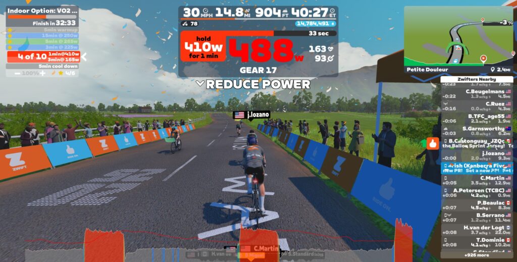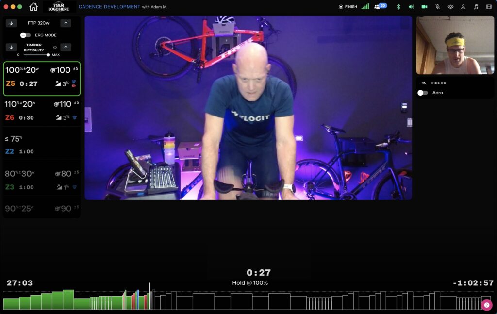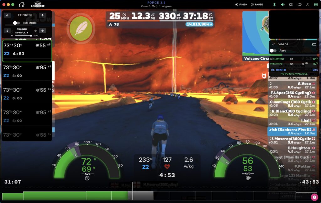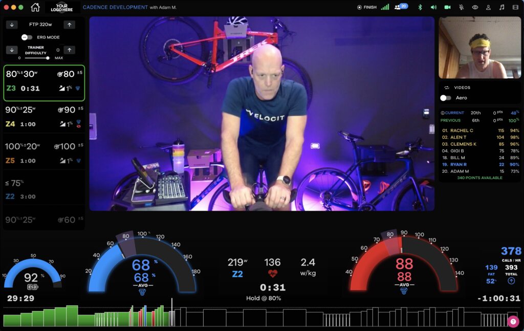 Specific features in the workout structure and the HUD provide real-time feedback on the extent to which you are hitting target power and/or cadence. For example, in this live group workout led by Adam Meredith, he is encouraging the group of 20 of us to select specific gearing to hit both the power and cadence targets.