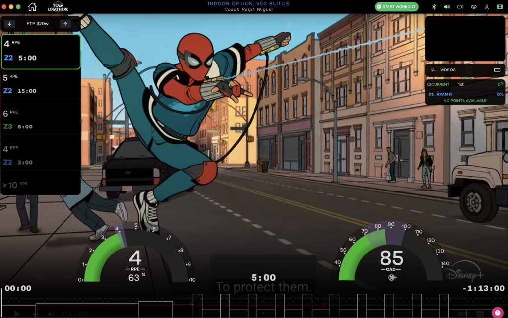 Velocity goes far beyond the casual acknowledgement of a gold star or checkmark to gamify workout fidelity in a number of ways. Rather than situated in a virtual world, Velocity is built around a group workout structure, in which video and audio of participating athletes is used to facilitate group learning led by a coach, social connection within a shared workout, and some friendly competition around hitting power and cadence targets. Velocity has options for completing live and recorded coach-led workouts, as well as completing your own imported workout alone in your own session.