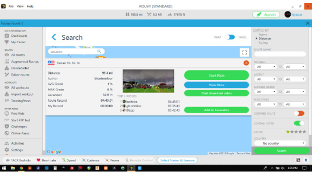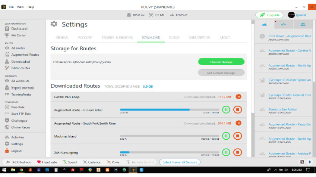 Getting back to the ride details, you will see options to save the route as a favorite or start downloading the video. Marking routes as favorites is a nice way to keep track of rides you find. Downloading is an appealing option if you have a slow connection and adequate available storage space. One note on downloading – this doesn’t act as a buffer like you might get on Internet video like YouTube, etc. If you start a download, finish the download before your ride. Rouvy will use the video file in its usable state in storage at the time of the ride start. If you only downloaded 20% of the video, you’ll be staring at a frozen screen 20% of the way into the ride. So, plan ahead if you download.
