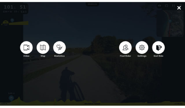 Here, you can toggle the views with the 3 icons on the left, relocate on the course to another rider’s position to ride with them (if there is someone else riding), adjust your settings, or end your ride.