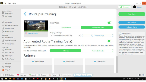 A new augmented reality feature of Rouvy is live interaction – if someone else is riding the same route you are, you will see an indicator of their position on the course. You can drag your indicator to their position and ride together. In the screenshot above, I had Mackinac Island in Michigan all to myself.