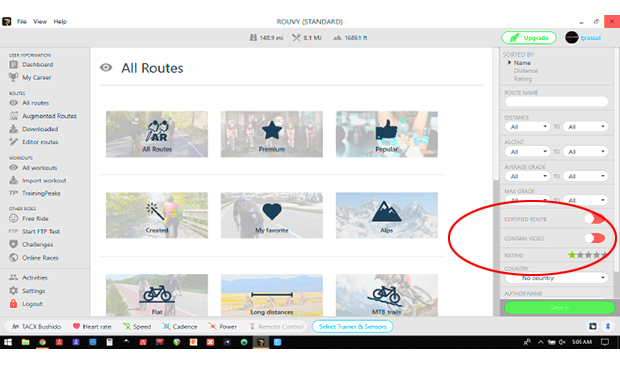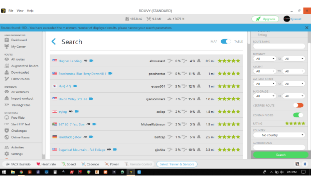 Rouvy has a wide-ranging selection of routes, which can be overwhelming and perhaps disorienting at first glance. As shown above, Rouvy provides several categories to help you find a route that suits your fancy. From the left menu, you can select “All Routes” and see the screen above. Note categories such as “Alps” or “Triathlon”. In total, the categories only show about 250 routes. Rouvy claims to offer thousands of routes, so where are the rest? The categories are nice to get a quick list of ride options, but if you want to see what options are really available, direct your gaze to the search tool on the right side of the screen.