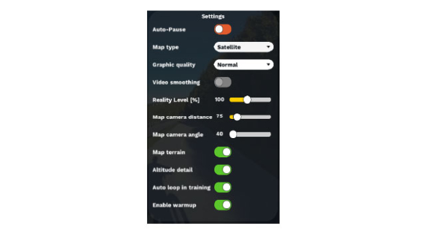 You have several settings regarding the map view, including satellite, outdoor, or street mode, distance and angle, terrain on or off, etc. You can adjust the graphics quality, which will change the controls on the screen, not the video resolution. You can toggle the video smoothing, and also adjust your reality level. If you have a smart trainer, this is how realistic the resistance feedback will be based on the road grade, your speed, and body and bike weight.
