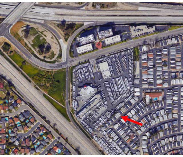 Now, having said all this(!) I must confess something to you. The fastest I ever got, afoot, not counting my semi-prodigy high school days, was when I rented a room in some fellow’s mobile home. Yes. Not rented a mobile home. Rented a room in a mobile home. It’s what I could afford at the time. This was in the early 1980s, and this mobile home backed up to a car dealership that was itself situation at the confluence of two freeways in the Los Angeles area: the Garden Grove Fwy (#22) and the San Diego Fwy (405). Satellite image below of the location of my trailer bedroom (roughly).