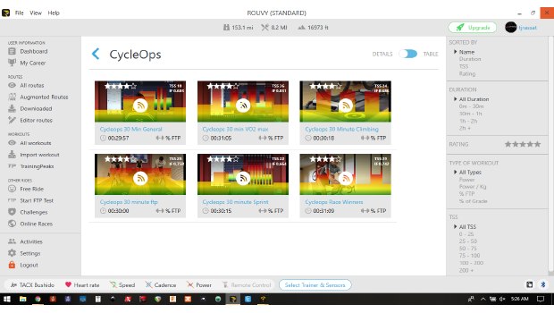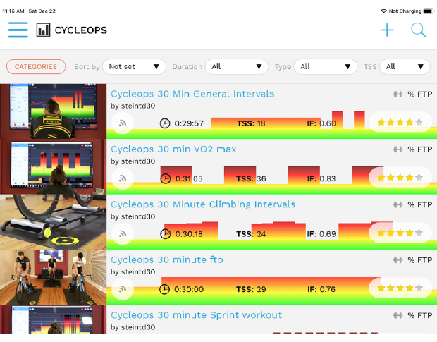 Rouvy’s Workout search is similar to the Route search – when you land on the All Workouts page, as shown above, you’ll see a selection of categories. As in the route search, these categories provide an easy way to find workouts that have been tagged accordingly, such as the CycleOps workouts category shown here, from the Windows and iOS (on an iPad mini) versions, one pictured just above and one just below: