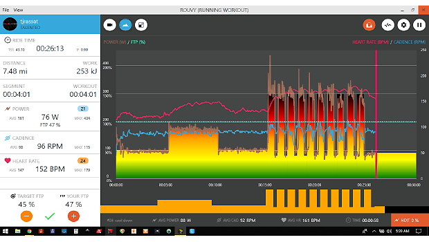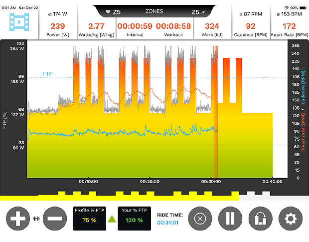 You’ll see squiggly lines representing your power, heart rate, and cadence form as you complete your workout. You’ll see your current and average metrics along with a few basic controls that allow you increase or decrease the target intensity if you need to adjust, skip to the next interval, or wrap up your workout early.