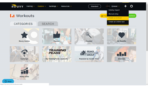 For those so inclined, the workout creator is available online and makes for a relatively simple way of creating your own workouts. When you are logged in to Rouvy.com, look for the big “+” in the upper right corner. You can select the “Create a Workout” option from the dropdown menu: