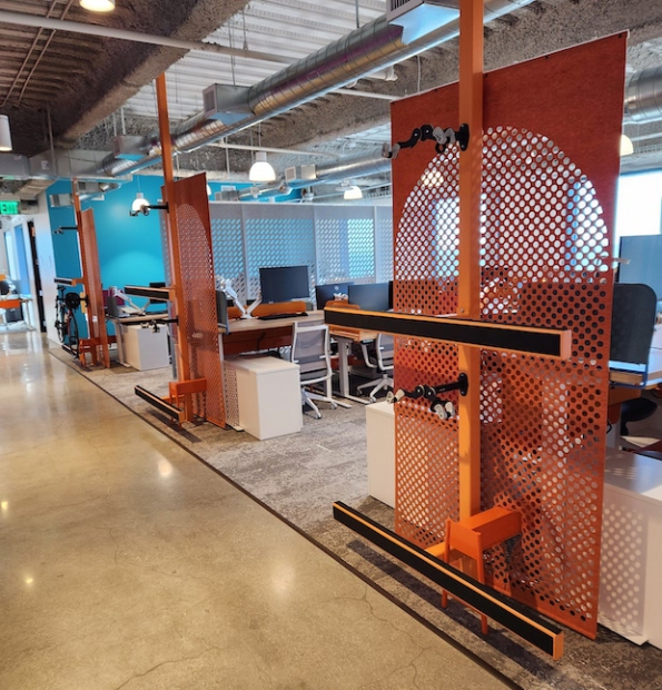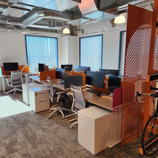 During Derick's tour of the three floors, I was impressed by the capacity for bike storage on the walls and at the ends of work station areas. He said at their previous headquarters, there were bikes leaning against walls everywhere, so they designed the new location with bike storage in mind. Add to this that there are personal shower rooms on the second floor and you have the dream workspace for bike commuting and/or doing a midday workout on your lunch break.