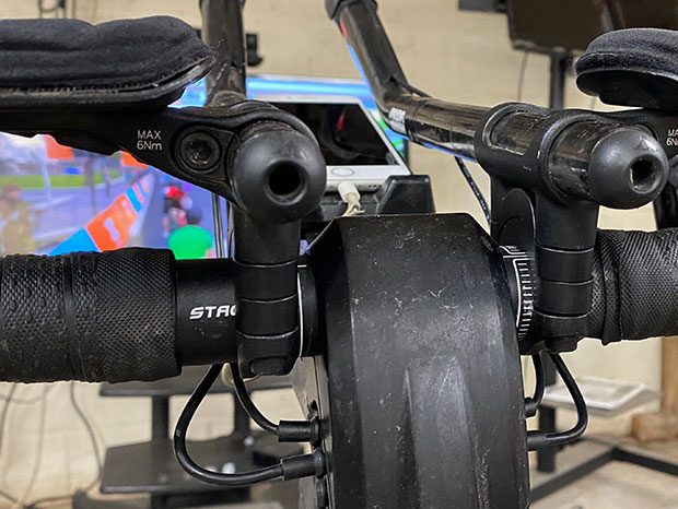 Age and tenure deliver an advantage: a cache of retired parts. For the Stages SB20 in my workshop I unretired a few parts, starting with a set of Profile Design clip-ons that I particular like because of comfort and ease of adjustability of the J5 bracket. For this use I found I needed to stick 20mm of pedestals under these bars to lift the bars above the console stand on this bike on which my handheld device sits (that’s another retired device I unretired, and I’ll get to that in a minute). You can see the whole set up in the image above. This pedestaling has an impact on the minimum height of the aerobar pads above the bottom bracket, which means some folks will not find this bike adjustable to their aero position. I’ll write in the near future about the practical limitations of this bike as an aero position tool. You can see the pedestals below.