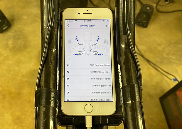 The gearing in all these smart bikes is changed inside the app. One unintended positive consequence from the omission (a blunder) of the gear display in the Stages bike is that this retasking of a handheld device as that gear display means that app is always open, right in front of you, and it’s convenient to change the gears whenever you want. That gear change display is shown above. Below is another screen in the Stages app that allows you to configure the buttons on both the road levers and these remote shifters we’re discussing today.