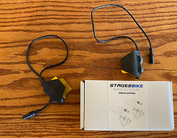 Smart bikes aren’t optimized for riding in the aero position. Assuming the bike can be set up to mimic your position – no certainty – it’s a pain to have to go to the road shifters on a smart bike to execute a shift. What I didn’t know is that Stages has a set of remote shifters – and has had these for a while – that solve this problem. I got a set – they cost $126; you can see this product here – and danged if that isn’t a solved problem for my own tri position riding.