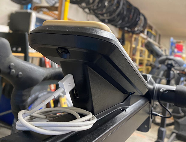 One thing I didn’t notice for the longest while: right in-front-of-and-underneath the phone mount is a pair of USB ports. I had a long cord running from the phone to an outlet in my workshop, until I discovered these ports (above). They’re powered, so, plug in and you’re good! Cool!