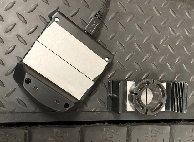 No problem. It just calls for a little MacGuyvering. I needed a *thing* that would sit in between the unit and the cradle, basically a solid foundation for the unit. So I rooted around the workshop until I found something, and with some 2-sided tape I affixed everything to everything else. I still didn’t have quite enough of a gap between the belt and the sensors, so I fashioned about another 1/8” worth of rider underneath the cradle and, presto, all good.