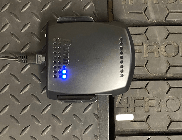 The RUNN device has its own rechargeable battery. It’s recharged with an included micro USB cord. That cord is too short for my purposes because, as you see, I’ve pretty much hard-attached the RUNN to my treadmill via the shims and 2-sided tape. But I have a USB extension cable and I now just have this thing plugged in 24/7. Here below is the the final installation of my RUNN unit, with MacGuyvered shims.