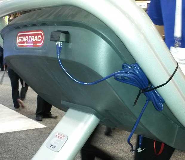 See this ethernet cable running in and around this treadmill? It's from Wahoo Fitness and it's called GymConnect. According to Wahoo Fitness, this will enable gym operators to easily create a wirelessly connected gym environment enabling gym goers to better track, manage and share their critical workout data for improved training and performance. It harvests data from the treadmill, to port into a training log. “The unintended consequence,” according to Wahoo's Mike Stashak, “was the massive interest in sending data the other way. We always knew we could do it but the interest in it far exceeded expectations.” What users want is a Borg Implant, to hijack and control the treadmill. This unit already has 2-way functionality. Wahoo is now a stakeholder in what I think might be just the frontier of a treadmill ecosystem.