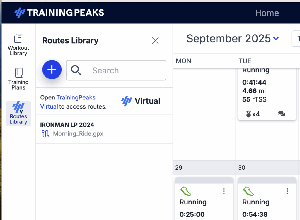 The process to create one of the Routes is relatively straight forward. You first have to be a subscriber to TrainingPeaks Premium accounts; Virtual is free open up your TrainingPeaks account. Once on the calendar, you’ll now find the Routes Library icon on the right hand side underneath Workout Library and Training Plans.