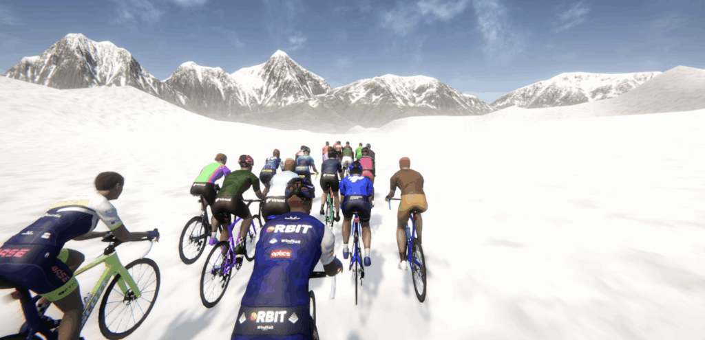 Then, once done, simply join your event. TrainingPeaks winds up rendering some virtual scenery around your ride. For my Lake Placid route, it started us off in the mountains, before descending into greenery for the bulk of the ride, then climbing back up. It’s not a rendering of the actual course, per se, but it at least gives you the general sensation of what the trip out of town and the descent might feel like visually. Occasionally we wound up on snow early on, but otherwise, we kept to the tarmac.