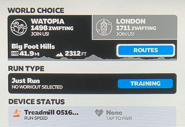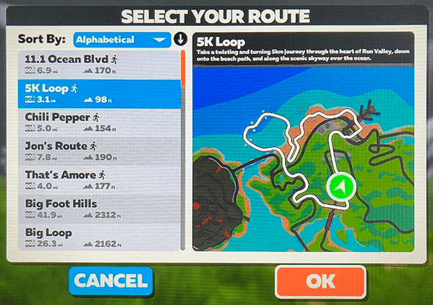 When you’re just getting ready to commence Zwifting – Run or Ride – you’re given a choice of Worlds, and when you select a World you’re given a choice of Routes. If you’ve chosen to Run on Zwift you have Routes available that you won’t see if you chose Ride.