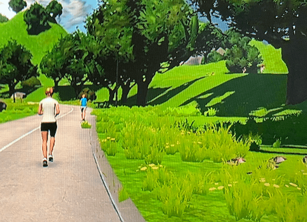What you’ll see on the run-only routes is that you often run within sight of roads with cyclists. The image below is taken by me with my handheld as I’m running on the treadmill, so, sorry if it’s a little blurry. I’ve chosen the Invisible Man viewpoint (where I don’t see myself in the Game). There are two runners in front of me, and if you squint you can see some cyclists on the road to the right. These riders appear (just by my observation) appear to be actually in the Game. Real time. Further, there are a number of "run-only" routes that aren't entirely run-only, but run-only part of the time, and then they merge onto a Route shared with cyclists. (You'll see which are which as you test these out.)