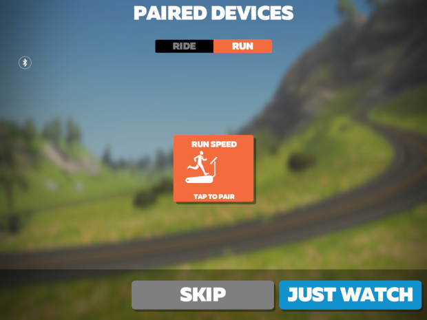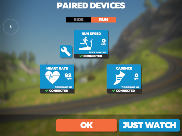 Pair your running devices. Initially, you won’t have all blue boxes as shown above. You’ll see orange boxes, and by selecting each one, can pair your sensors. If you’re using a heartrate monitor, you can pair that at this time, as well.