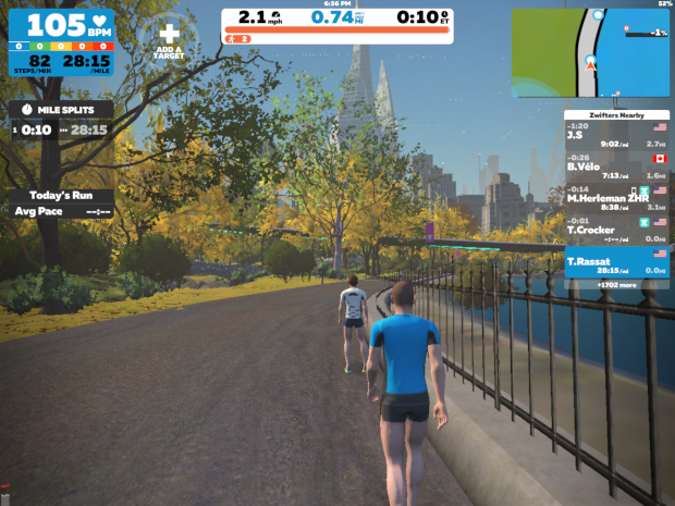 The running world is a bit behind in this regard – the idea of running with power is still fairly new, with running power meters such as STRYD having only been on the market for a couple of years. Runners have other sensors – such as accelerometer-equipped footpods and heart rate monitors – that have been doing the job for years. Zwift can read certain types of these sensors and use that information to display metrics and move your avatar on screen. Running in Zwift is roughly equivalent to cycling in Zwift using a classic trainer and zPower: It’s taking input from devices that send a signal and translating that to the virtual world.