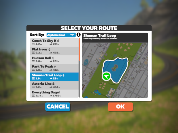 In each of Zwift’s worlds, there are several routes options. Most are also cycling routes, but there are a few runner-only routes. Select your route and select “OK”.