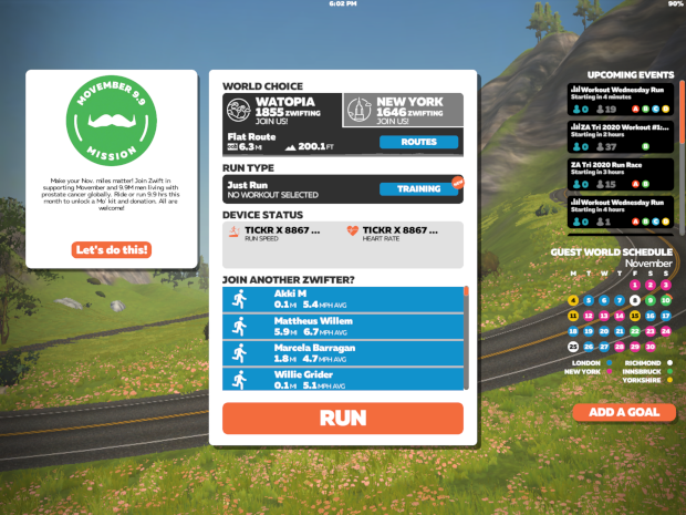 You’ll return to the route/run selection screen where you can select “RUN”. You should see something like the image above. Choose the desired speed on your treadmill and your avatar will move accordingly. That’s it – you’re running in Zwift!
