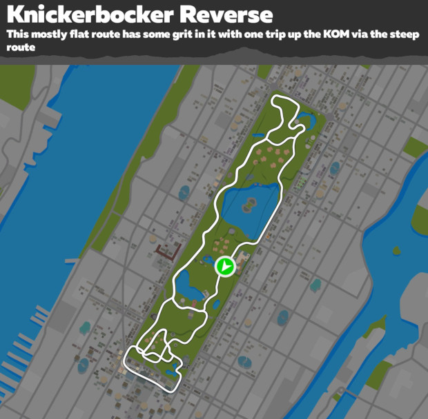 As the name implies, this is the Knickerbocker route, but pointed in the other direction. Overall, this route is pretty flat, aside from hitting the New York KOM just past halfway into the route.