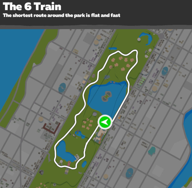 The 6 Train is short and relatively flat, with a couple short climbs all at ground level within Central Park. After a .4 mile mostly downhill lead-in, you'll be treated to a mostly flat ride with one short 10% grade climb and a couple of other more gentle, short climbs. This is a fun one if you want to complete the route but only have 20-30 minutes to ride.
