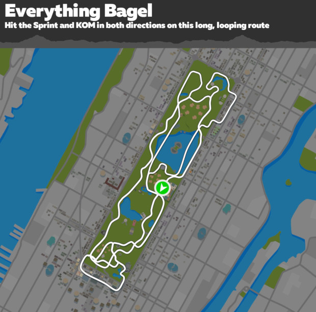 Everything Bagel is currently New York's big dog – it is the longest route with the most elevation gain, and you'll hit the KOM and sprint from both directions.