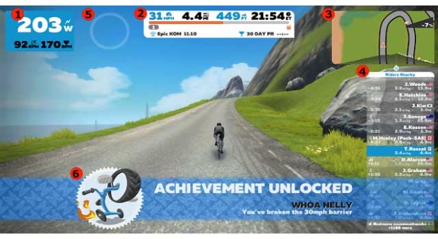 Once you’ve chosen your route and started your ride, you may find the amount of information on screen overwhelming at first. The Zwift HUD (Head’s Up Display) provides a lot of information about your current ride. Let’s break the screen down: