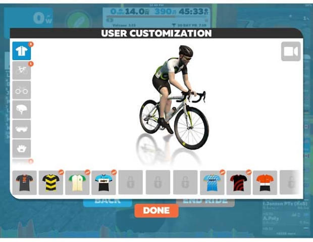 Either of these methods will bring up the User Customization screen. On the left side you can select different aspects of your avatar that you want to customize – your kit, your bike, and the appearance of your avatar. In the beginning, you have a fairly limited selection of gear options, but as you continue to ride, you will earn new gear – kits, bikes, wheels, socks, and more.