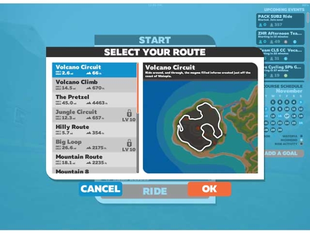 Within each course, you can choose a specific route from the list of available routes. Within each locale, all of the routes are interconnected. As you ride, if you don’t change direction at turns, you will stay on the route you selected at startup. Some routes have to be earned – for example, you must achieve level 10 to unlock the Jungle Circuit.
