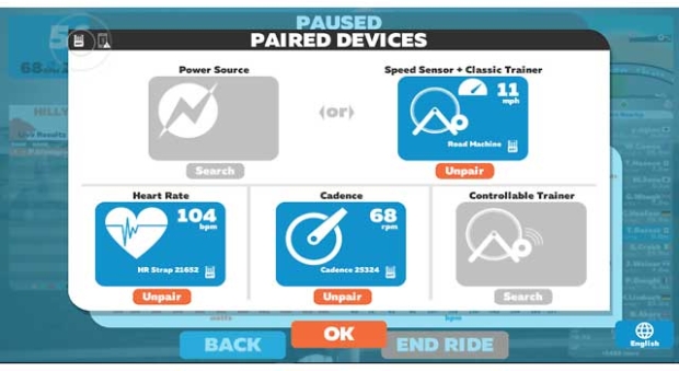 Assuming everything is plugged in and operational, hop on the bike, start to spin, and fire up Zwift. The first screen you encounter in Zwift is the Device Pairing screen: