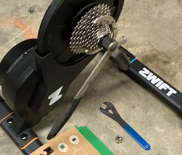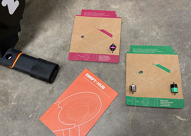 One thing that might confuse the uninitiate is that the included 17mm open end wrench can’t grab the flats on the drive side QR cap (that one must remove for a disc brake bike). You don’t really need the tool, because Zwift doesn’t tighten down that threaded cap. You can reach in with nimble fingers, unthread it, and thread on the thru axle cap.