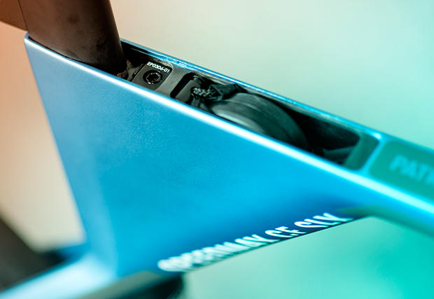 His name is featured on the top tube and the storage is neatly hidden away right behind it.