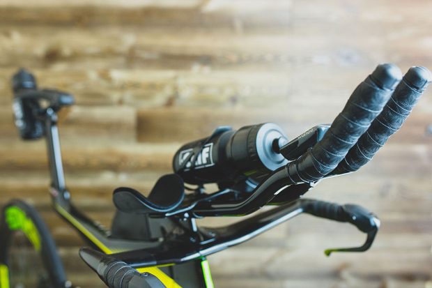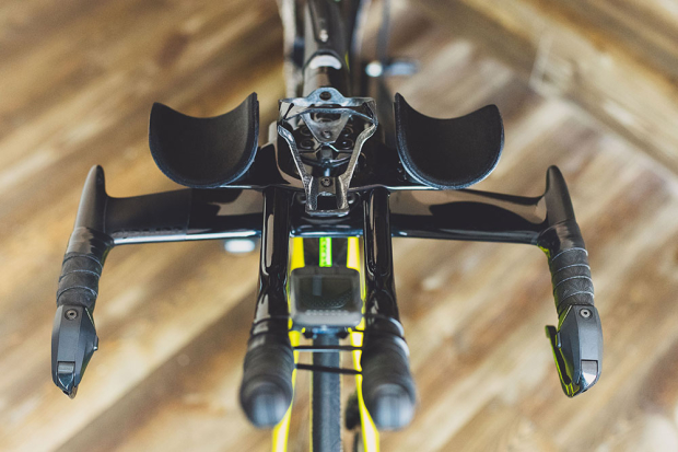 The cockpit as seen from above. Hoffman mounted his Wahoo Elemnt Bolt computer with zip ties between the Enve extensions. The bar tape is by SupaCaz.
