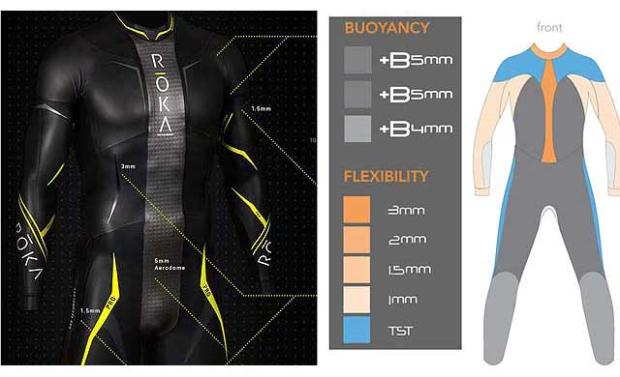 Let’s talk about this $500 level. In a future article we’ll overview this as a price point, and pick winners. blueseventy’s Reaction and ROKA’s Maverick Elite II are each in this category and each fares quite well. In fact, I like each one of these suits more than I like each company’s top-o’-the-line wetsuit if you consider value on the invested dollar. The Reaction and other downstreamed blueseventy suits start to peel away at the rubber thickness in strategic areas. The cheaper the suit, the thinner the rubber. This leaves blueseventy open to competitors’ suits that maintain 5mm rubber in flotation panels throughout.